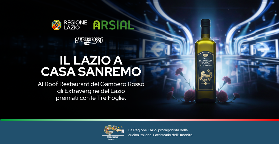 Il Lazio approda a Casa Sanremo, nel cuore dell’evento mediatico più seguito d’Italia. Al Roof Restaurant gestito dal Gambero Rosso, una selezione dei migliori oli extravergine della regione sarà protagonista di degustazioni dedicate, portando qualità e identità olivicola laziale in uno dei palcoscenici più prestigiosi della scena nazionale.