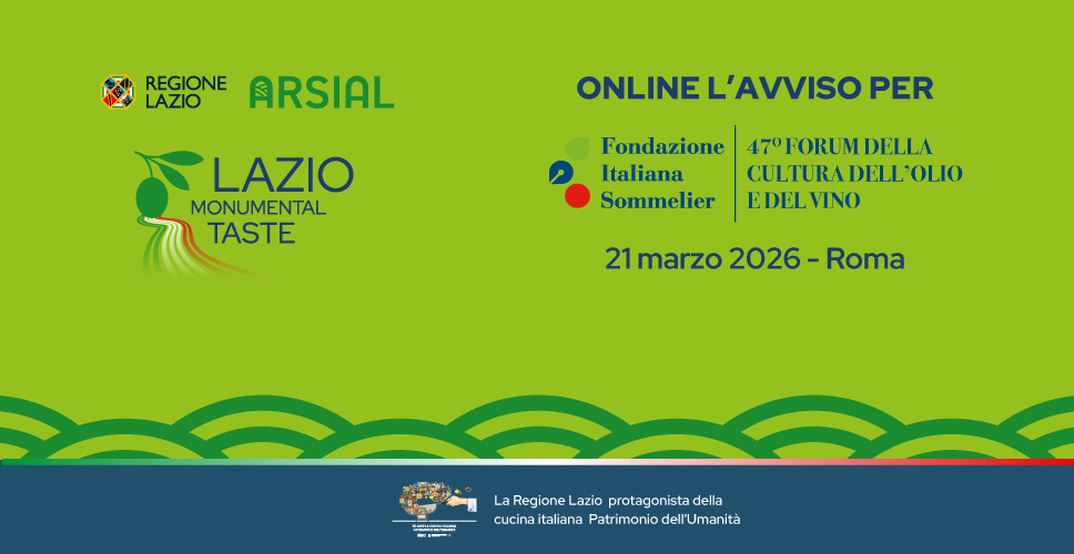 È online l’Avviso pubblico per la selezione di 10 aziende olivicole del Lazio per la partecipazione, a titolo gratuito, al “47° Forum della Cultura dell’Olio e del Vino e Festa delle Cinque Gocce”, in programma il 21 marzo 2026 presso il Rome Cavalieri Hilton di Roma.