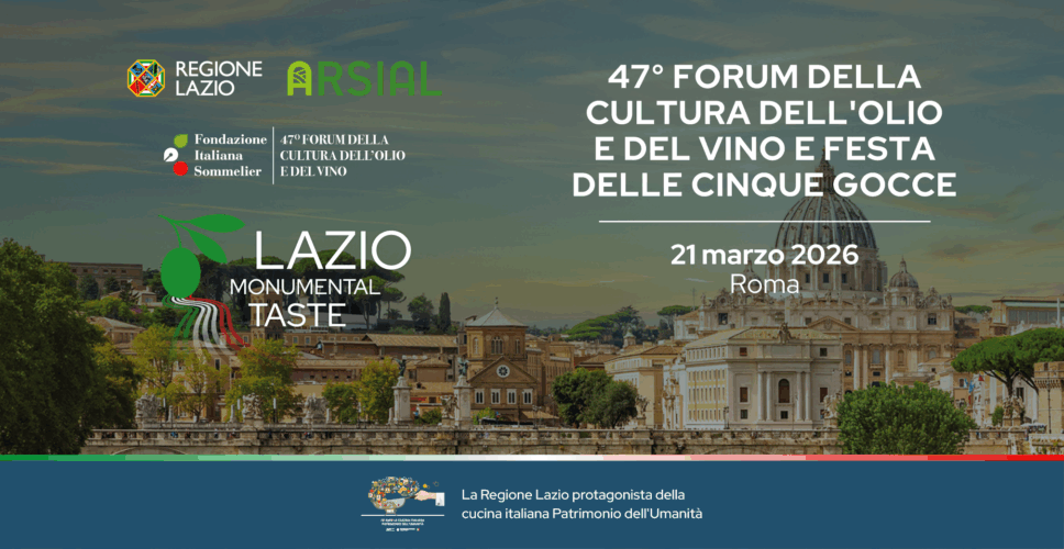 L’olivicoltura del Lazio primeggia in uno dei contesti più autorevoli dedicati alla cultura del prodotto: il 47° Forum della Cultura dell’Olio e del Vino e Festa delle Cinque Gocce, in programma sabato 21 marzo 2026 presso l’Hotel Rome Cavalieri (Via A. Cadlolo 101, Roma), organizzato dalla Fondazione Italiana Sommelier.