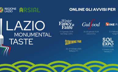su Sono online sul portale Arsial gli avvisi pubblici dedicati alle imprese interessate a partecipare a Winter Fancy Faire (San Diego), Gulfood (Dubai), Wine Paris (Parigi), Slow Wine...